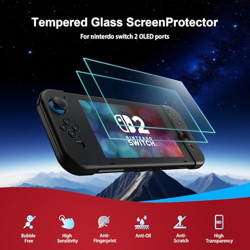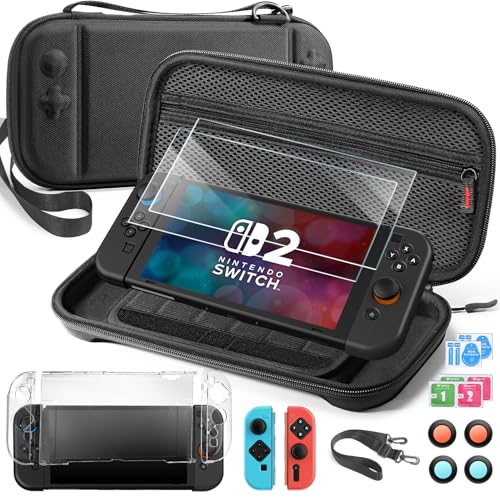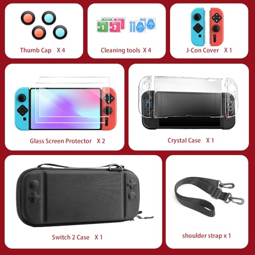 All-in-One Switch 2 Accessories Kit: Complete protection bundle including: 1x crossbody carrying case with adjustable shoulder strap, 1x clear PC console cover, 2x transparent TPU Joy-Con cases (1 pair), 2x silicone handle protectors (1 pair), 4x silicone thumb grip caps, and 2x 9H tempered glass screen protectors. Console not included